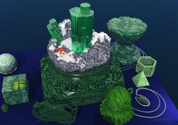 One or two things were rushed to get it completed; I actually intended to put a very small bevel on the large green crystal, but realized at the last second it was a surface material, not a volume material, so I couldn't just negative boolean pieces off. (the crystal is actually a terrain.)