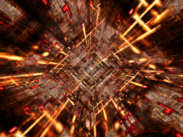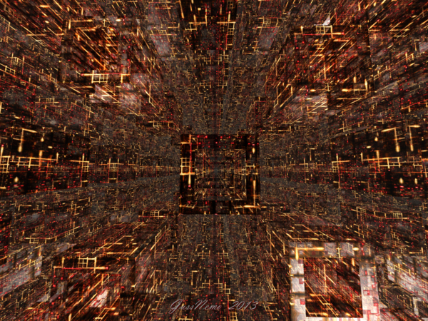 Something I might say, which I should have said, about the fourth image in my previous post. The material in that image is the black structures within that image. The yellowish color is a diffuse color given to the reflective cube surrounding the central cubes. The camera is actually positioned so its looking at the wall behind its normal position of looking down the boolean cube. This view was the more interesting of the two rendered.