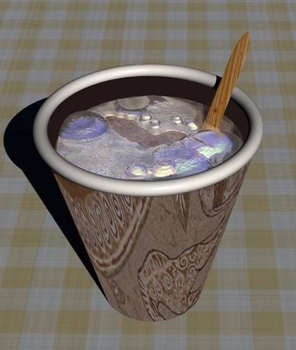 here is a render I did using both of my suggestions: 1 surface as a 2d circle. Used a Ripple water from Bryce waters, changed the color from aqua to a reddish brown and lowered the transparency to about 45-fiddled with it. I duplicated that with a second one made more transparent. Then I used a terrain and used New in the Terrain Editor and just did some "bubbles" with the brush, added some "mounds" then erased into a circular shape and erased a patch in the middle. Added base noise a couple of times. Set the clipping pretty high. I used a David Brinnen material on that and placed in a tad under the second 2d layer and just on the 1st 2d layer. Streched the terrain of foam around in the cup. Hope that gives you some help.