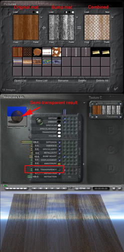 Thanks also, Sean...you can see the result (below) – this time with a wood mat. After taking a copy of the original coloured wood mat, and saving it as a grayscale bump map, when I combine the two it turns out semi-transparent. The bumpiness is there in the final rendered image, but it isn’t opaque; rather as you see it. I wonder would I have settings like World Space etc., thingies to do?