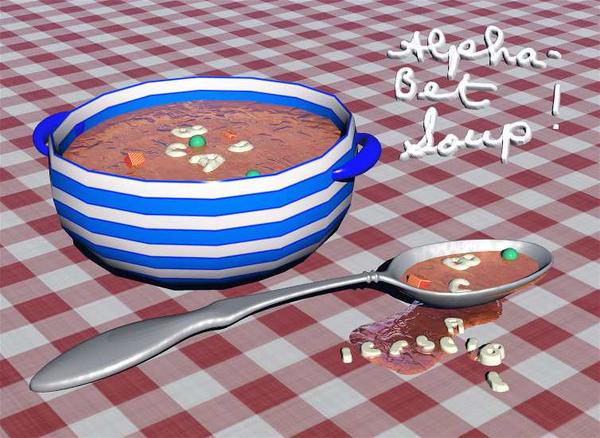 Also, one can import a image as a mask, the image being test, or an image of text say as an old Victorian initial and load it in the Terrain Editor. So it's "pure" Bryce then, LOL! You can set the material to not cast a shadow, as I did with the Alphabet Soup below. You can make a series of letters, such as I did from one terrain, and a different series from another.