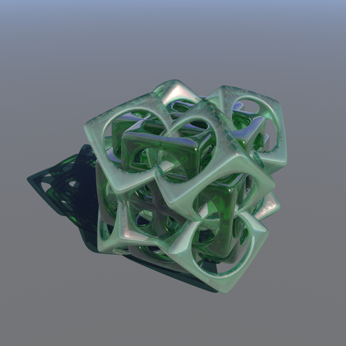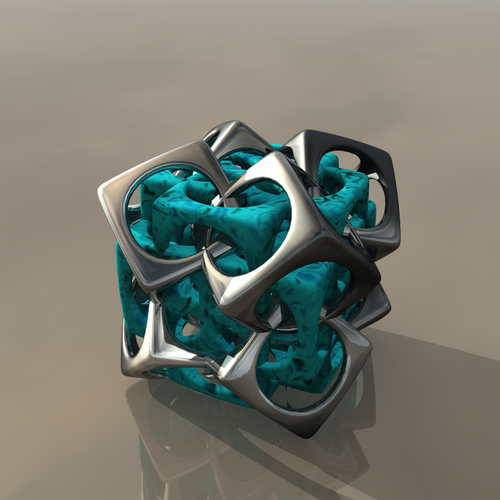 And here is my attempt at David's two part woven cube. I know the ground for the cube with the green material looks bland, but adding any material to the infinite plane pushed the render time out the roof.