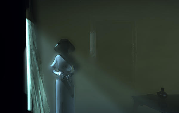 Playing around with the volumetric side-of-things, initially wanted to centre in on dust (there are about 25 groups of groups of particles here) and light striking them...etc. However, throwing in the model, adding in fuzzy mats over it at certain parts, the work took on a whole other direction.