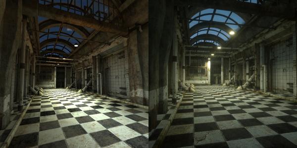 I like both of the inside building images, each for different reasons. In the Bryce image I don't see covers on the lights, which might hinder/filter the light. Take the cover off a bulb and it's brighter, more intense. The lights in the Octane image seem to have covers, dirty ones, scratched, or broken ones. Look at a light with one of those and it really filters the light. And the light in both images reflects all of this.
