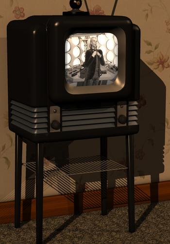 I remembered I had a retro TV (uh, sorry, "tele") prop with a "bake-lite" type casing that I thought might look appropriate for "framing" my Hartnell render. I ran the original render through PaintShop to gray-scale it, add "grain" and video type "scan lines" before adding it as a texture to the prop. Slap a floral print "wallpaper" to a plane, a wood grain to a rectangular polyhedron and a Berber carpet pattern to the ground plane and suddenly we have an unassuming early 60s British domicile within which to position the tele' "broadcasting" an episode featuring William Hartnell.