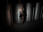 The mesh is a custom Poser rigged figure for a "restoration" team called Who3D. The group, originally lead by one of the merchants here, Cliff Bowman, had the goal of recreating "lost footage" and episodes of Doctor Who. I was a member of the group's forum (not the restoration team itself) and I was fortunate enough to download the "work in progress" figure. I can not remember if it was Cliff Bowman, Nod, or another member who modeled and rigged the figure. (If any of them read this post, hopefully they can fill in this memory gap.) I say "work in progress" as it did not include the chest mounted life support box or the hip mounted "gun". Those elements I downloaded from the personal site of another Who3D member, Adam Bullock. He modeled several items in Anim8or format, (a free 3D modeling tool). I converted them to .OBJ format which I could then import into Poser. This past week, I tweaked his pladrons and chest box in Wings3D, refining them a bit. I swapped the included hands (seemingly based upon one of the very old Poser 2 figures) for the far more realistic "stand alone" hands in Poser Pro 2014, and experimented like crazy in the Material Room to mimic the clear plastic outer raincoat layer. Finally, I positioned and posed three copies within AntFarm's "Tyco Station" environment which is meant to depict snow.