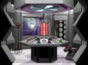 Anyway, having read about this rejected feature inspired me to add it to Grinch's set. I found a Poser ready astrolabe model. I removed the stand and loaded two copies, shrinking one a bit and rotating it upon the vertical axis, centering it within the first. I added a flattened torus to serve as a framr for the "hole" and I used a capsule primitive for the glass dome housing. Admittedly, it's pretty much guesswork, but this is how the "Newberry" wooden console might have looked if the production went "all out" as originally planned.