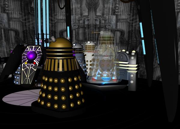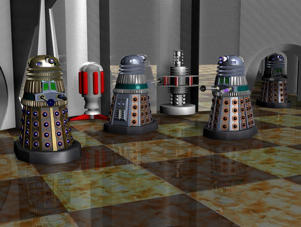 Playing around with a few models here - Alan Dempsters Attic TARDIS, and transmats, Daleks by Billy home, Mechmaster, and Samtherapy.