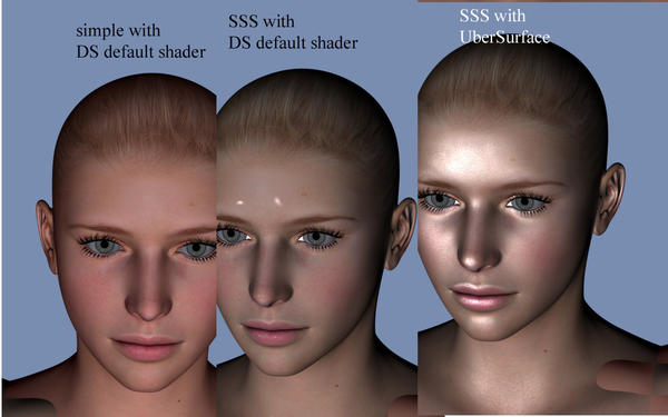 Hmm... so here is a comparison. On the left is the so-called "simple" surface that comes with the character, in the middle is the SSS surface (both using the DS default shader). On the right is the SSS surface again, but this time I have applied the Ubersurface shader (ctrl-loaded, so as not to replace maps) The lighting is the same in all three cases - a distant light at zero degrees and 50% with a specular only spot at 45 degrees left.