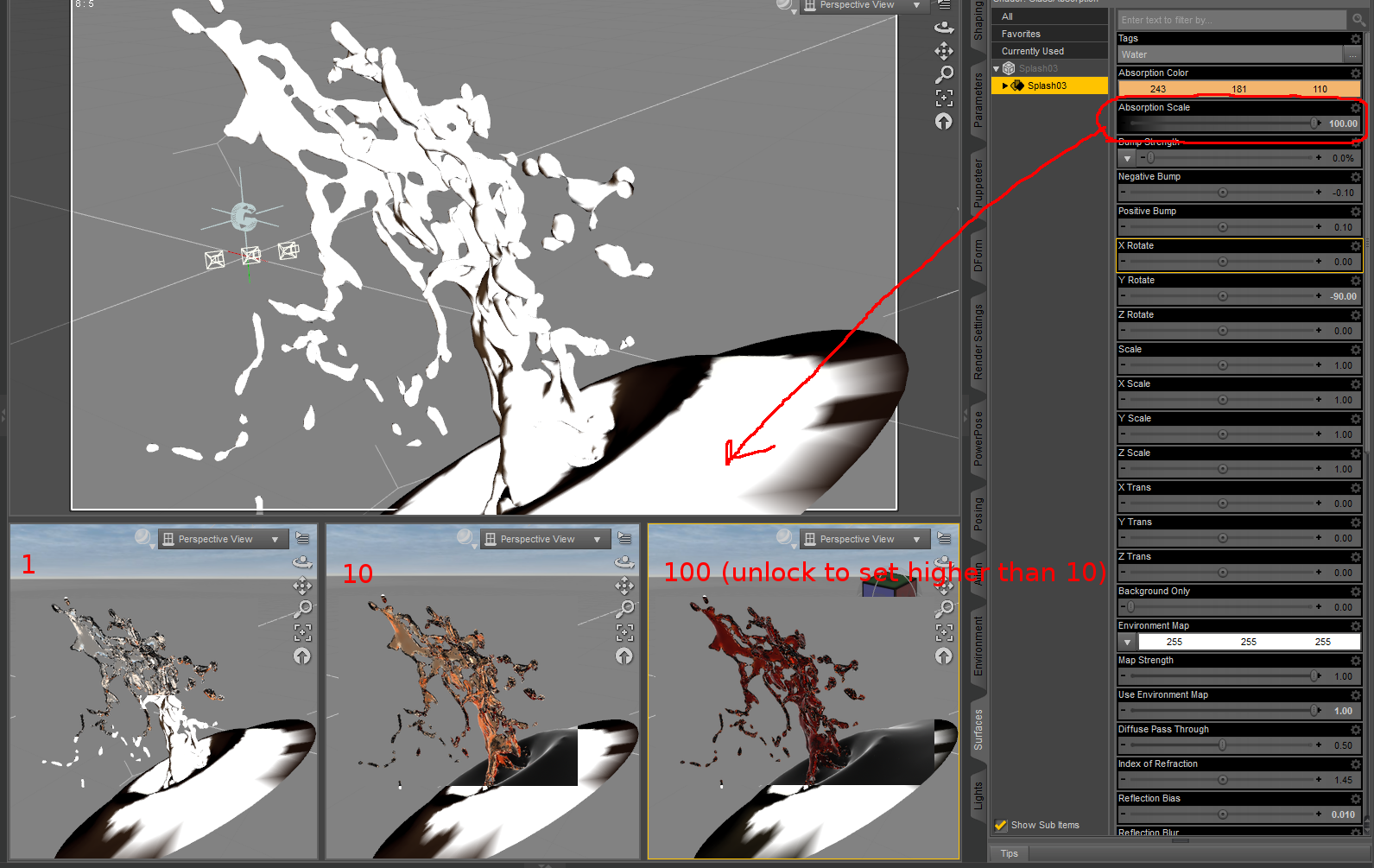 I looked at the shader network in the shader mixer... and remembered why I'm scared of the shader mixer. :-) Perhaps it could be modified to adjust for scale if I can figure out what corresponds to the attenuation per meter. Possibly the render bias parameter (without the need to actually modify the shader)? At this point I'm randomly pushing buttons and I haven't yet figured out how the color exactly corresponds to anything, but here are some experiments, using just the top section of the one object that seems to be working and ignoring the disk and the other object that might have the normal issue (I'll need to reinstall hexagon and read up on normals, but that's a bigger project that I want tonight.):