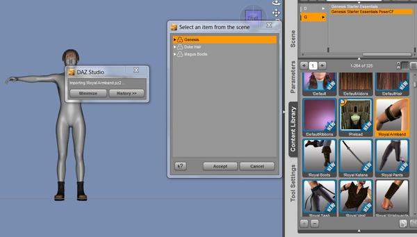 If you get the "Select an Item in the Scene" prompt, when there's nothing selected, then the file you are loading is some kind of settings file and not an actual item. Also watch for having variations - here you have Royal Pants and so on, and probably there are other-word Pants and so too - that again tends to indicate that you have settings for varying the way an item looks, not the item itself.