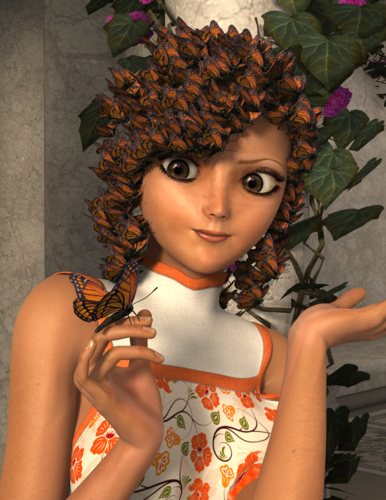 The first test had almost 3000 instances of the butterfly and my pc ran out of ram. Had toedit the mesh of the hair in Hexagon to get a better spread and enlarged the butterflies. There are now 520 instances of the butterfly in the scene, the rotations are randomized within a given parameter.