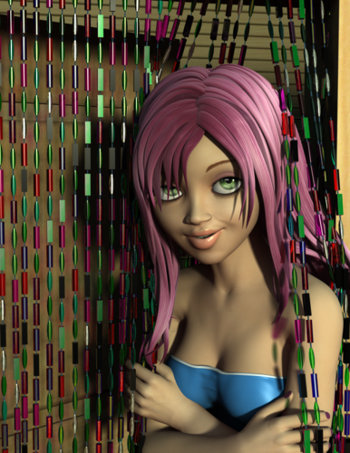 The bead-curtain. Made a number of ribbons in Marvelous Designer and draped them over Jazlyn. I instanced the beads over it, unfortunately they were all pointing straight up so i spend quite some time manually rotating a few hundred of them... -sigh-