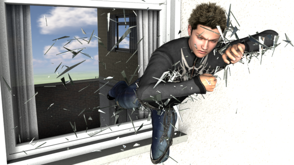 For this one i modelled five shards of glass and applied the glass shader. I ran Freak5 in a running pose through Zbrush's qRemesher to get an even distribution of vertices an let a script add over 7000 instances of the shards to the mesh. Rotation on all 3 axis are randomized and I gave each instance a 20% chance of a random Z-translation anywhere between it's original place in the mesh and world center, to get the trailing effect.