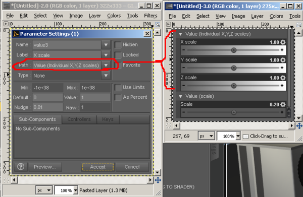 Is there a way to control the order in which the parameters appear in the Surfaces(color) pane? For example in this pair of screenshots (Surfaces(color) pane in blue) the Scale parameter is stuck in the middle of the X scale, Y scale, and Z scale parameters. Not a big deal, but it might make it marginally easier for others to use if the X Y and Z scale parameters were grouped next to each other where they can be more easily found.