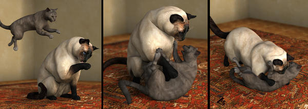 (Since dis is a mini contest and nobody said nuttin' abouts touchin' up, I fixed da big cat's belly in Photoshop 'cuz Millennium Cat don't allow for no fatness - he looked like he had sum kinda little belt an sum drapperies on his belly.)