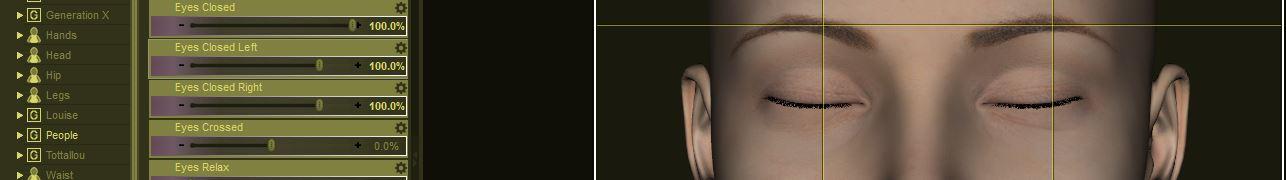 So I load G8 Male and female no morphs at all ,and I go to the parameter tab /Pose Control /Eyes /Eyes Closed ,and dial it to full .....oh look the lower eyelashes are now above the upperlashes and poking through the eye lids .... okay so I make a help ticket ....get a response ,they are unable to create the same issue ,hmmm so I pull up G8 Female ,do the same thing .... wow her eye lashes are doing the same thing ,so am I nuts? Is it just nobody uses the "eyes closed" dial ,or doing close up on the faces ....... or have I just managed to FUBAR my Genesis 8's .....