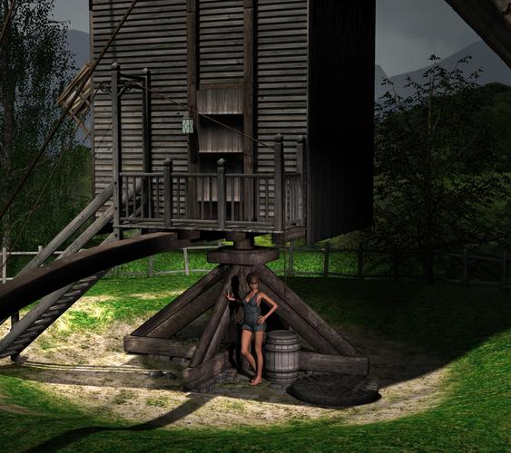 Okay, back to The Windmill. This is a side view with the low intensity distant light. I left the spotlights on the lower level (which would be off for an artistic render) and I would be increasing the lighting. Just want you to see consistent lighting so not changing it. Love that background! (I was tempted to put a red "X" and an arrow pointing to the hills with "Mori_Mann is HERE." I decided to behave myself.)