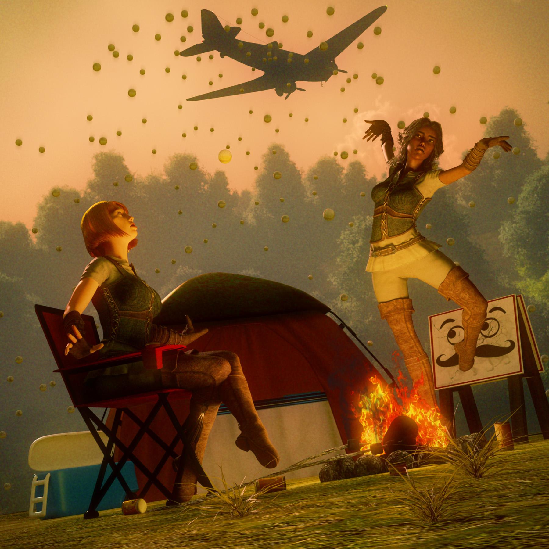 After being run out of Piccolo Villaggio, toon-boys Braydon and Aiden took their meager earnings to buy passage on a cargo plane full of Bank-a-Ball balls headed to carnivals in the U. S. Being bored they horsed around a bit and somehow a door flew opened. Down below Gabriela and Julie's camping vacation was rudely disrupted. Fortunately they were not injured, although their tent was beyond repair.