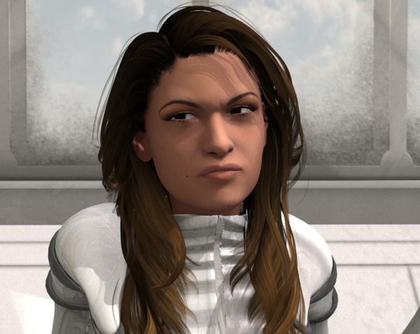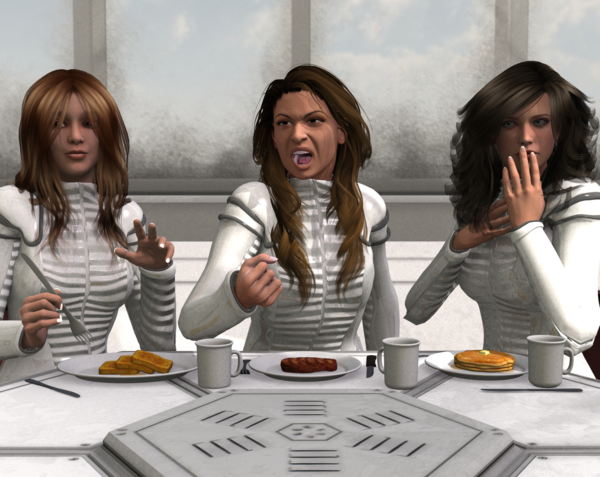 While I certainly would love to have better lighting and shadows for the sets and props, the fact is that I really like the way the characters look with the normal lighting. I've made exceptions for the GIS sets, because the sets look so much better with the special lighting than without. An example would be Aurelia (Reby Sky). Here are some panels I've used in the comic. The first two use the GIS Orion set with the GIS Lights product. I actually prefer the way Aurelia looks in the third photo. I think it has more of a comic-feel to it than the first two.