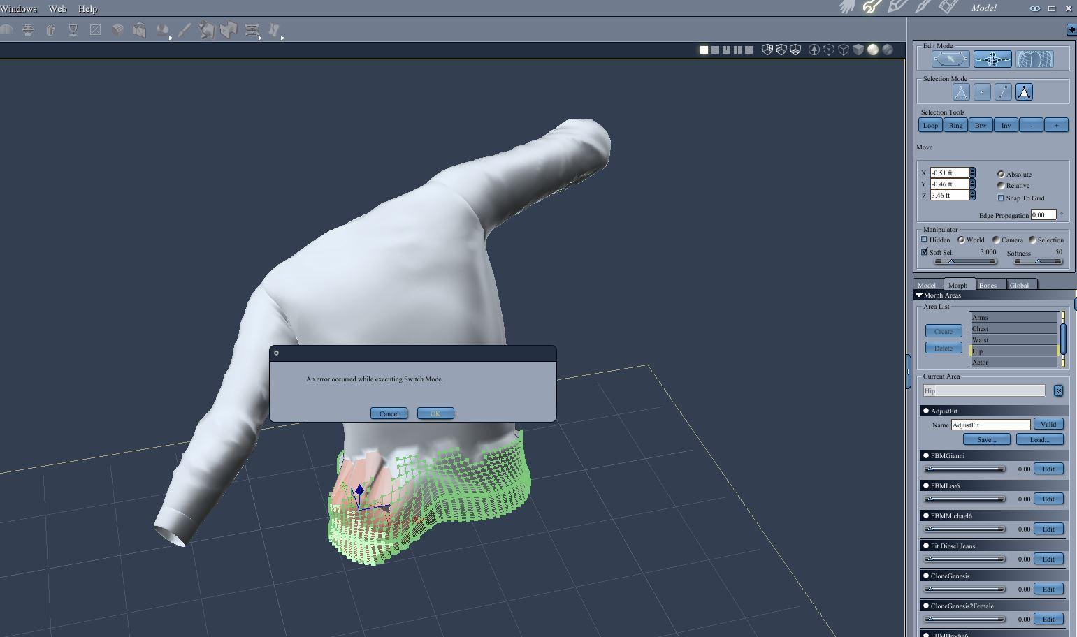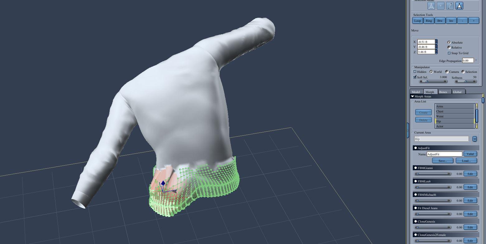 That was the bad news. But there is some good news, I can still stay in the modeling mode of the vertex modeler, select the back left hip area of the shirt, ignore the topology warning, and simply pull the shirt vertexes to eliminate the poke through. I can also create a morph and save it out and load it as a new morph using Daz Studio's morphloader pro feature. Here, I simply remained in Carrara and pulled the bottom of the shirt. No Daz Studio usage.