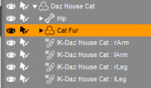 2. I own but haven't used the cat so I gave it a try. After loading and choosing a material using Smart Content, the cat rendered but without the fur, just the base color. Looking at the scene pane, I saw there was a Cat Fur child to the cat (see image). Choosing that, and adding one of the hair materials, I got the hair to render. It's a little clearer in the Content Library, as materials are sorted by Base, Complete, and Hair which makes it clearer as which to use. I did find it odd that the hair sometimes rendered and sometimes didn't when I would choose different Complete materials.