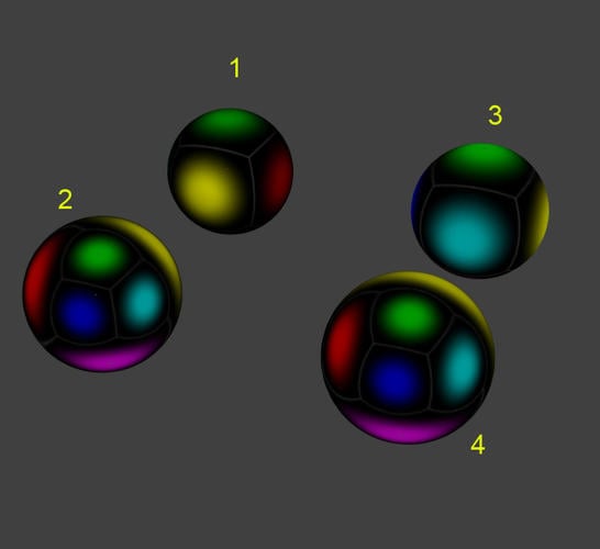 2) The front and left of the upper sphere, torus, and cube are the same colours (cyan and yellow respectively) - so why is the top of the cube imagenta, while the top of the sphere and torus are green?