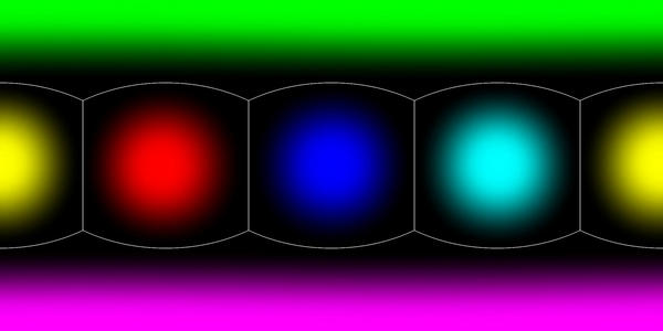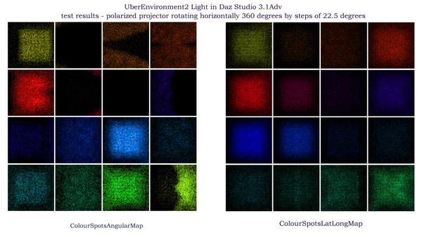 Imagine that you're Victoria 4, or Genesis, or Posette, or whoever, and you've just been loaded into DAZ Studio / Poser in the default pose. There are six different coloured lights around you, all pointing at you from different directions: blue from in front of you; red from your left; green from above; yellow from behind; cyan from your right; magenta from below. That's what the 'ColourSpots' test images represent - they're mainly for testing lights. The other 'AzElGrid2' imagines are simply an azimuth/elevation grid at 10° intervals (like the latitude/longitude lines on a globe or map of the earth - those are mainly for checking the orientation and alignment of skydomes, reflection mappings, etc, and to see whether you need to do a left/right flip to the image.