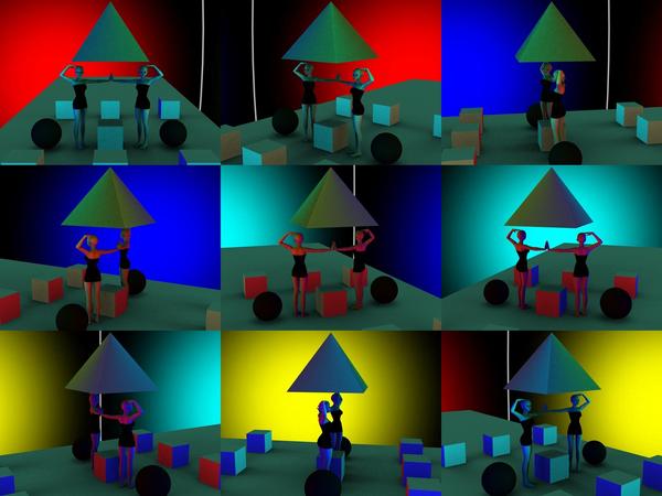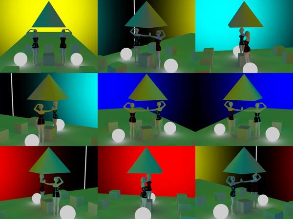 as for the yellow, which should be most visible at frame 3 and 4 ... we kinda seem to see it on the Aiko's arms but the cube faces facing us look green-gray, which could indicate that many light colors are visible on that side of the universe used by the renderer ... instead of one big yellow blot