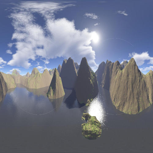 *N.B. If you want to create your own HDR images this way I'm fairly sure that you can (although I haven't tried yet) After creating the six renders from Terragen Classic, you do exactly the same renders again, but set the exposure lower/higher, so it picks up more detail from the dark/light areas. Do this for two higher exposure and two lower exposure settings. Then use HDRShop to combine the 5 exposure settings for each view into a single .HDR image. Then use CinePaint or similar (GIMP for HDR images) to combine the six HDR images you've created into an HDR vertical cross. Then use HDRShop to convert the HDR vertical cross to an HDR angular map. That's hat I've read anyway!