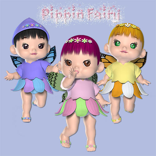 Pippin now has a fairy outfit. Skirt, top, cap, hair and foot flowers and wings. The wings need to be parented to Pippin's chest, not conformed. Three sets of mat poses.