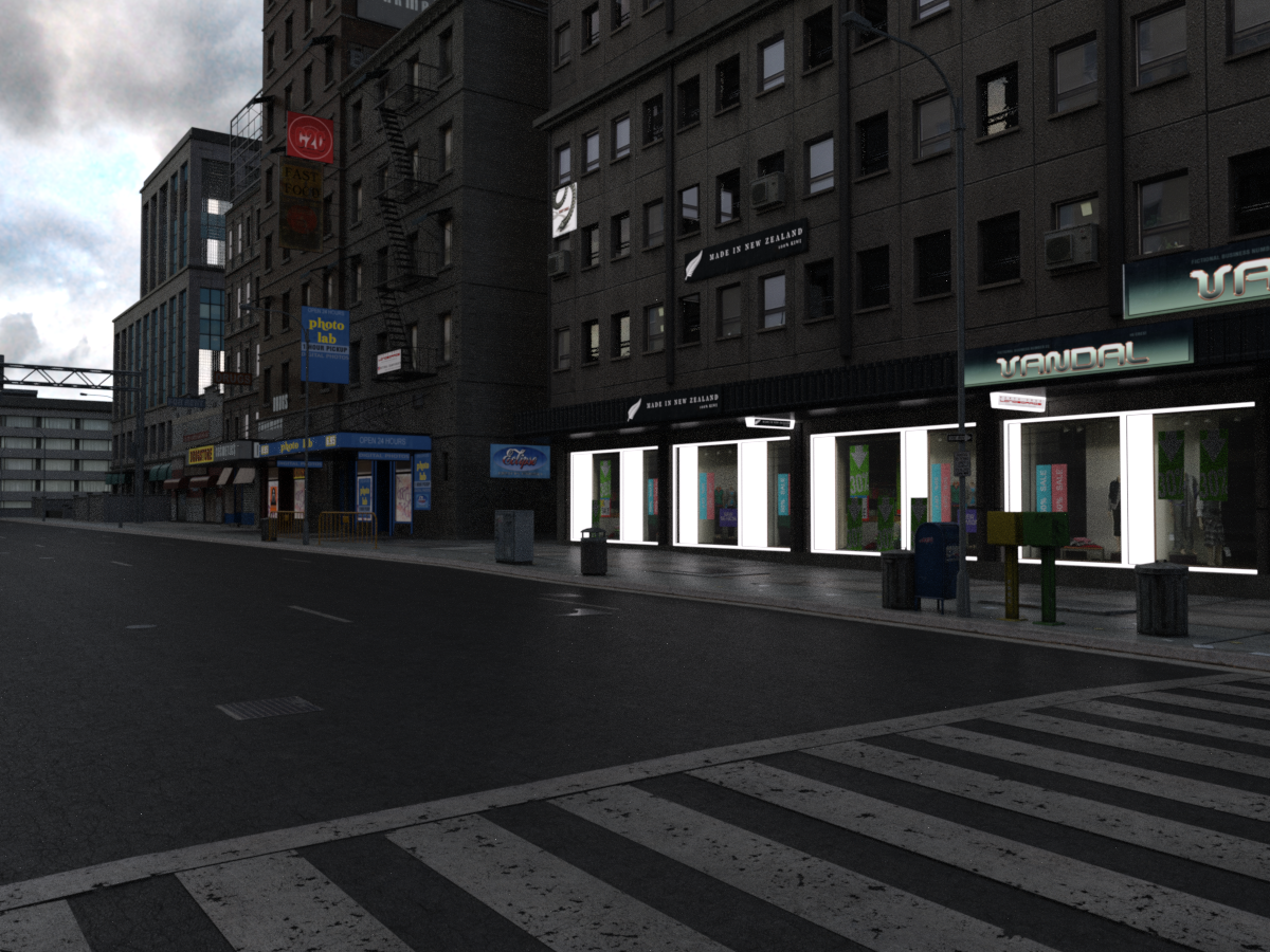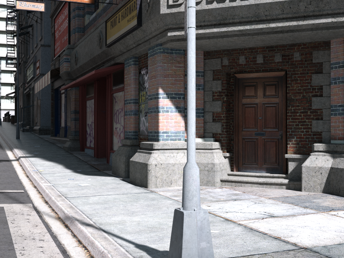 All right: starting with an oldy-but-goody. Urban Sprawl 2, by Stonemason. Released in 2009, folks. While its daylight presentation under Iray might not make Stonemason proud, most of the rest of us have nothing to scoff at. These are literally 'load, delete skydome, load one of the Terradome HDRIs, press render'. The biggest problem I had was finding it because for some reason it lurks in Lost and Found.