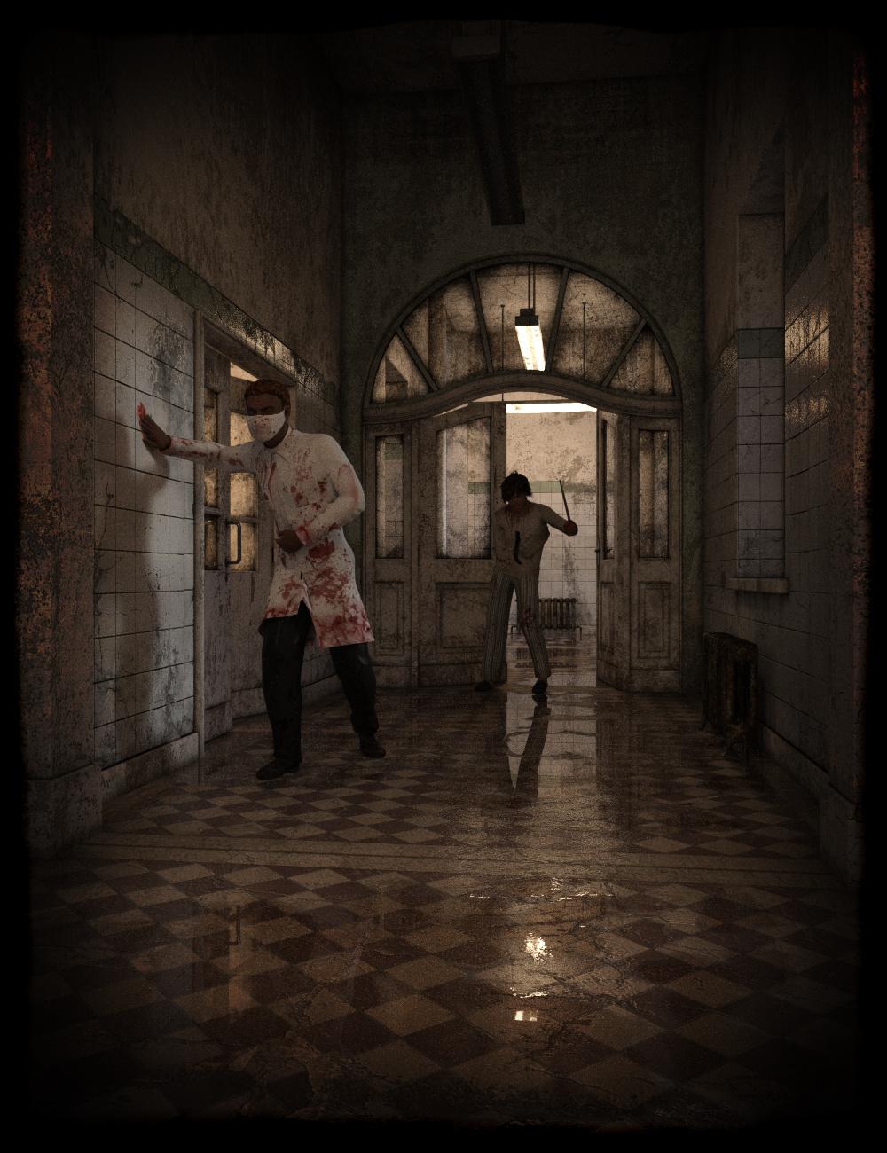 I used Stonemason's Through the Woods and deleted all his trees. Then I used Ultrascatter to put 100 instances of the five dark trees over the terrain. I used AtmoCam to add the foggy atmosphere, with a couple of spotlights to mimic a bit of moonlight getting through the fog. I tried making the image lighter, but then I lost the tension of the mood. So this image is best viewed full-screen with the lights off.