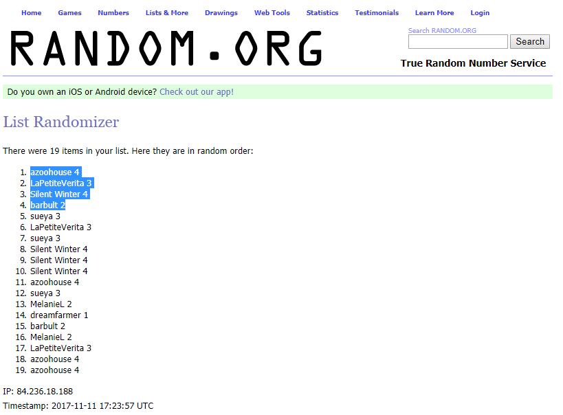 We also have some random winners. Everyone, other than the main winners above, got one chance per entry. Using random.org, the list was randomized to pick the winners: