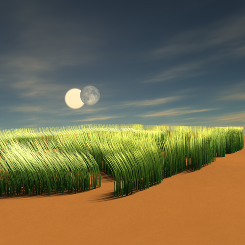 This example uses no image maps (pictures or illustrations that are mapped to the surface of the object) to generate the textures on the dam. The water does use a picture I painted in Photoshop for the foam streaks in the falls. The foam at the bottom of the dam is also built with without image maps. The same for the cattails and rushes.