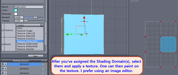 Since Hex does not render, I usually make shading domians in Hex but export and do shader or texture mapping in other program such as Carrara and/or uvmapper.