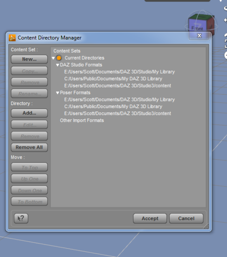 With the content directories set up as they are now, do any of the top-level folder (the ones that appear immediately under DAZ Studio Formats) contain a folder called Content? If they do that's wrong, and needs fixing (either by pointing DS to the Content folder instead of the folder it's currently pointed to, if there's nothing else in that folder, or by selecting everything in the Content folder, cutting it, and pasting it into the folder that holds the Content folder). The folders named Runtime and Data should always be in the actual folder that's listed in the Content Library, never in a sub-folder of that.