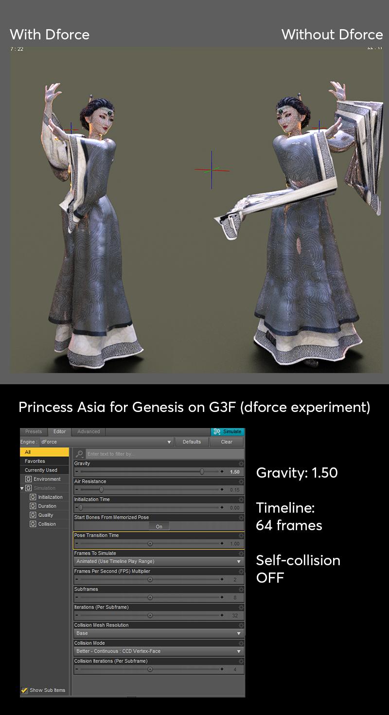 Figured I'd contribute to this thread with my latest experiment. That is: Princess Asia for Genesis + Precious Princess textures fitted to G3F via wear them all, then applying dforce to the underdress and overdress. Out of the box, the dress does pretty well (much better than I expected). It's not without its problems, however, and poses that keep the arms too close to the body proved troublesome (the sleeves kind of merged with the rest of the dress). The sleeves didn't behave until I gave a longer timeline to simulate (and let the fabric settle down).