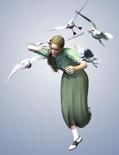 Here's a couple more images from the "Bird in the Hand" pose set... The top image is a pose called "Pet Bird" and has settings to use the Owl, Vulture, large Songbird and large parrot model bases (Owl with M5 shown). The bottom image is the pose set called appropriately "Hitchcockian" and has settings for V4, M4, Genesis, V5 and M5 plus using either the Songbird base or the WF3 Gull model base. (Western Gulls and V4 shown)