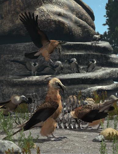 Vultures2 has 12 new vulture species including the Greater Yellow-headed Vulture ("they wait" in thread), the Hooded Vultures (who cry "Mama, mama" when disturbed and in "they hunger" image in thread), the Indian and Himalayan Vultures (Zombie image), the White-rumped and White-basked vultures, the Slender-billed Vulture, the Lesser Yellow-headed Vulture, the King Vulture (with it's turkey-like wattle), the Cape Vulture, Rüppell's Vulture and the long-awaited and requested Lammergeier or Bearded Vulture (shown below, with the white-rumped and slender billed).