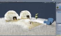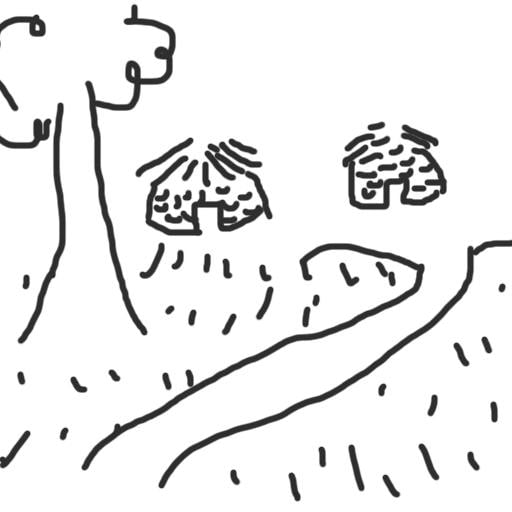 My goal is to have two hunters carrying game along a worn path back to some stone age huts.