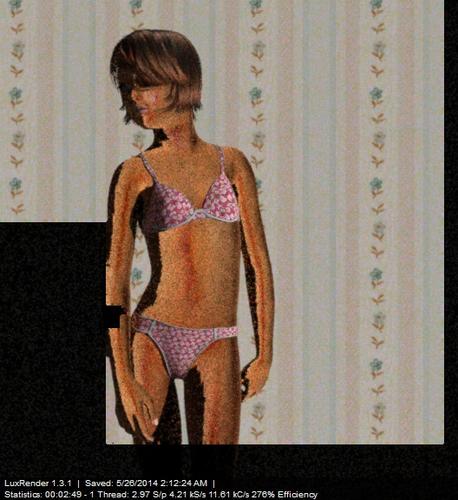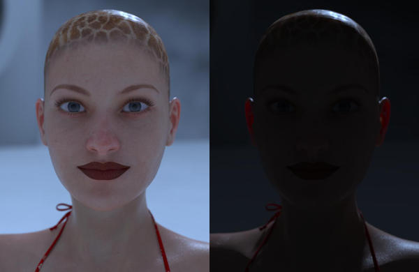 Had much better results switching to Glossy, with Michael_G's settings from post #184 (example on the right, below). I added a little bit of Absorption (depth: 0.4, color 32,77,102 - from Slosh's chart in post #151) to bring a little more color to the skin. I think this looks fantastic, especially considering a low-res texture like Lana, but would love some opinions from those with a more critical eye than mine.