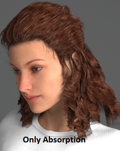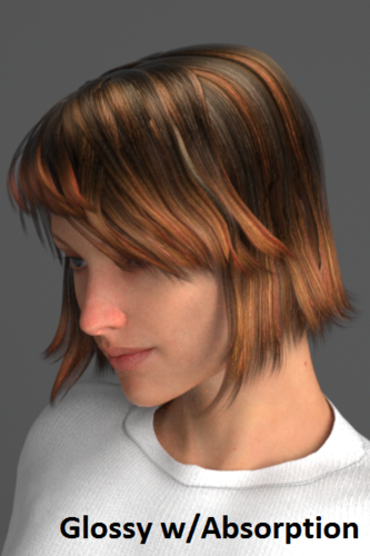 Without a specular map on the hair the glossy settings will make it look like a helmet. Here are the two examples with Matte Sigma 90 and then Glossy with essentially no glossy settings and an absorption color of RGB 16-65-128 and 0.5 absorption depth. The absorption color and the depth is really a matter of taste, but remember it is opposite of the color you want in the object.