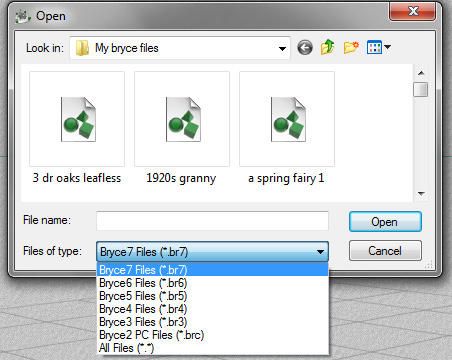 Bryce 7 can read files created in all earlier versions back to Br2. I can't conform if it will also open Br1 files as that version was Mac only and I use a PC.