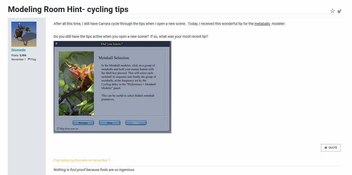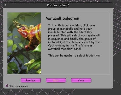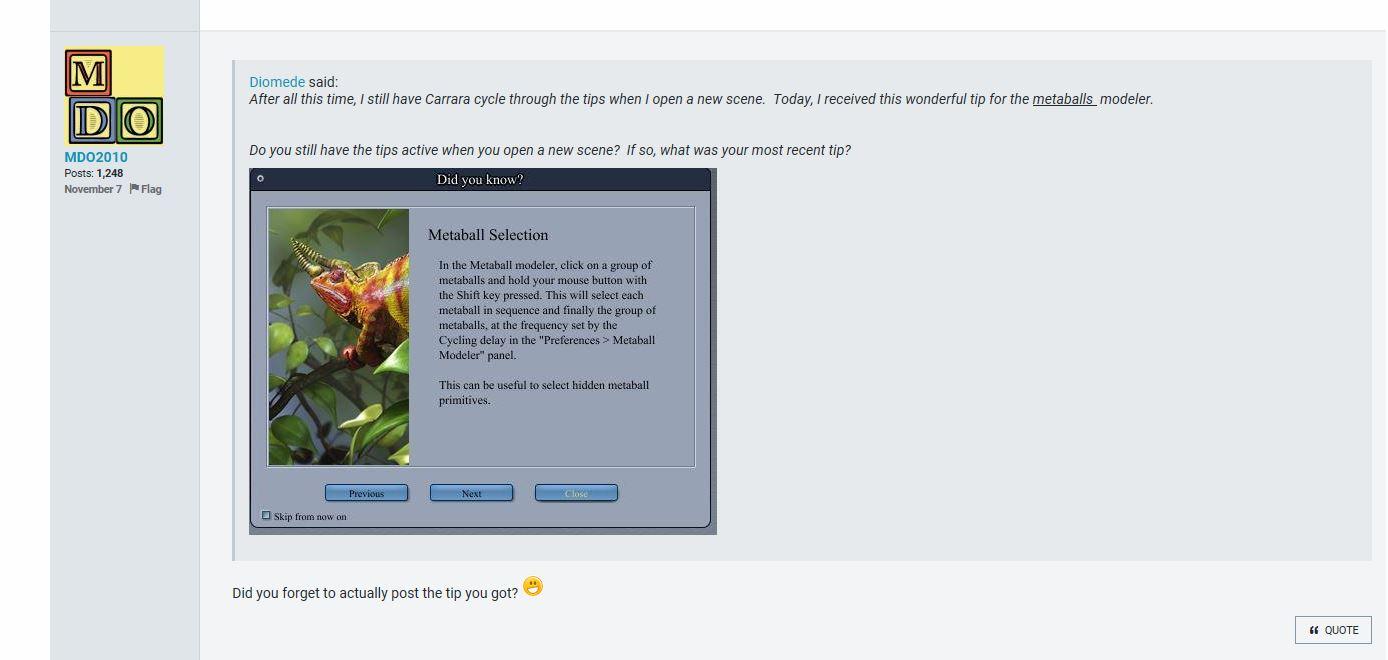 After all this time, I still have Carrara cycle through the tips when I open a new scene. Today, I received this wonderful tip for the metaballs modeler.