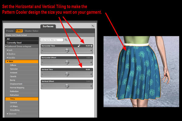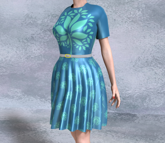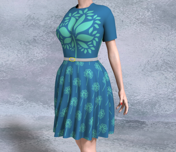 You can choose different tiling values for different surfaces of the garment, to get interesting effects. Here I set tiling to a smaller value on the dress bodice, to get one large pattern. I set tiling to a negative value on the sleeves. (Didn't even know you could use negative values before I tried it)