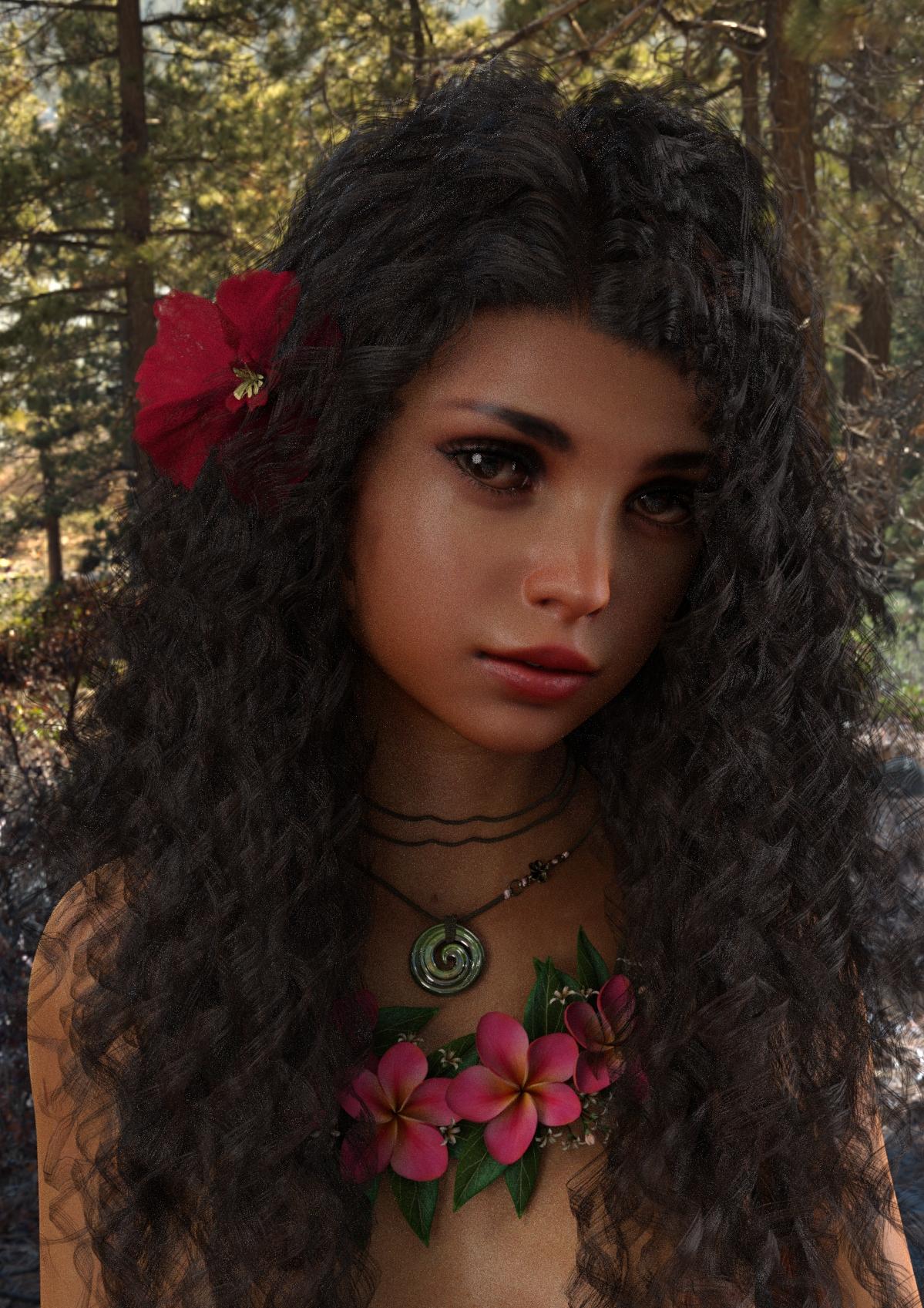 So, since I haven't seen a side part, loose bangs, sort of version of curly hair, yet.  I've been playing with DForms on the closest I've found, the Karissa Hair, to try and get that romantic style.  I made two versions, one with the crown volume thinner, part to the right and bangs loose forward.  The second is the same but with the right side pulled behind the ear. I would like to have another single strand on the left front that could be pulled stray over the left eye.  But, the model seems to have that portion integrated into a larger hair section.  Possibly, it could be done with a cutout...or a separate add on lock.