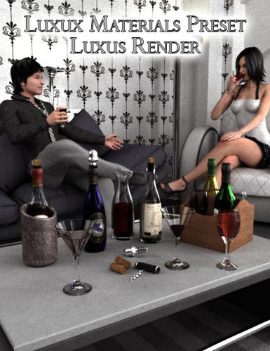The entire Wine Me set includes both 3Delight and Luxus material presets. Those of you with Luxus will enjoy in particular the pre-configured glass settings. 3Delight users will want to increase the Ray trace depth to a 6 to 8 range as the default of 4 will not properly render glass.