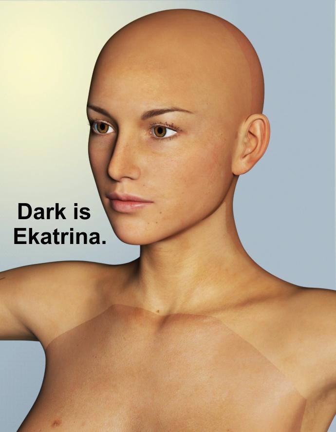I want you to see this. The Genesis 3 Female Base and Ekatrina without materials. Please click on and open the first two.  Click back and forth. I expected to see a uniquely morphed character.  (It is advertised as a character, not just a material product.) The miniscule changes in the head surprised me. I didn't even bother with the body. When I get a character I expect the head to change and become a different person!