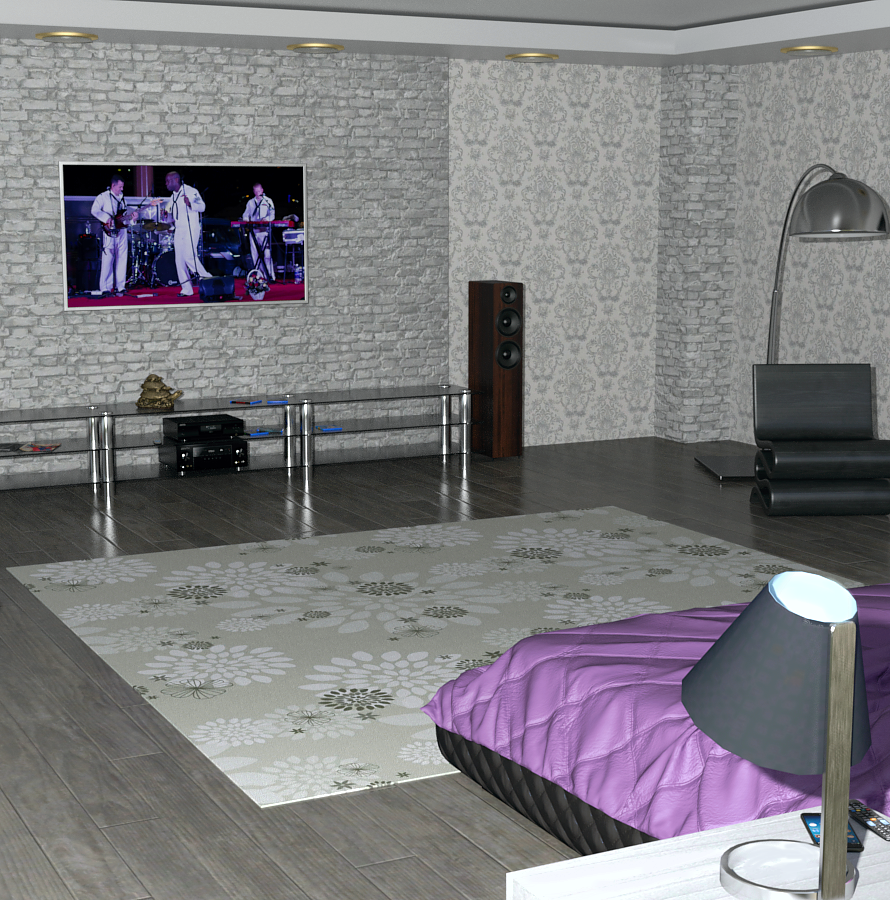 The walls can each be hidden and there's nice details. It's also a spacious room, you don't feel crowded when swinging the camera around. It's easy to select props and hide them (such as paintings on the wall) if they get in the way when you hide that wall.
